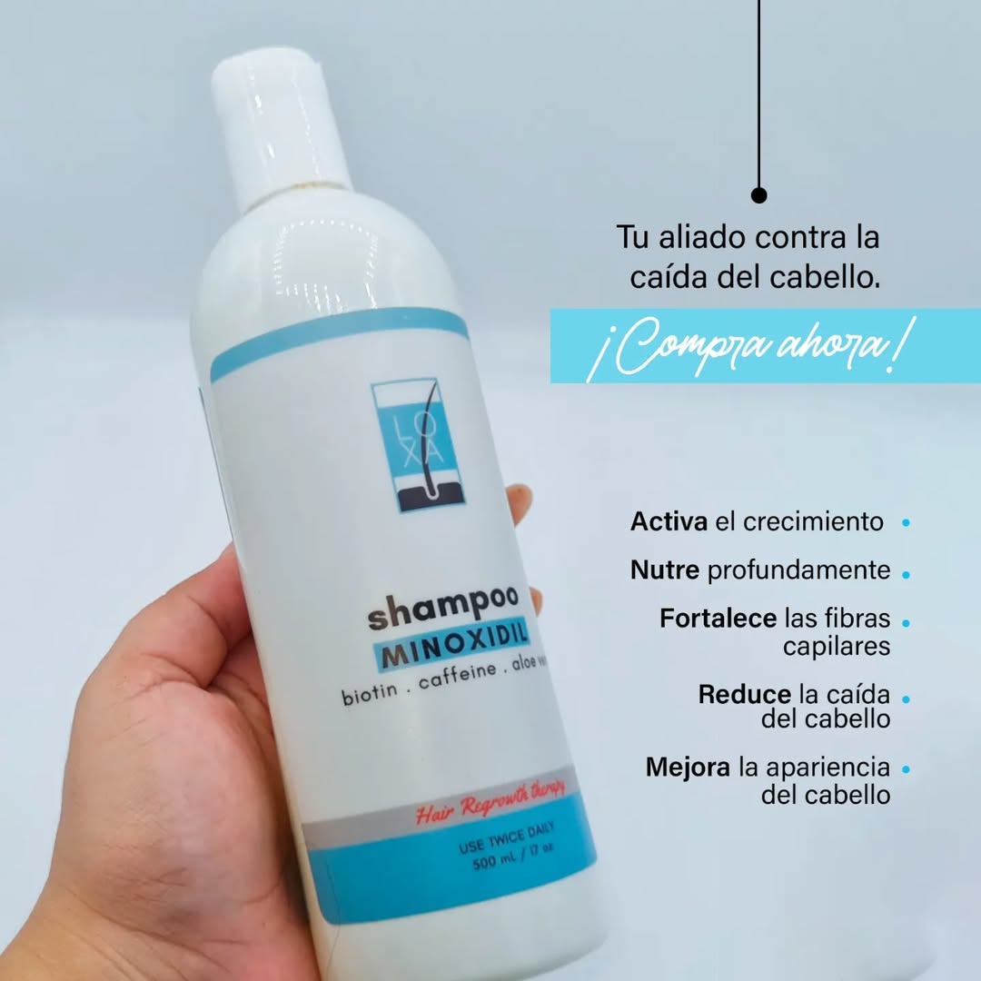 El shampoo LOXA con MINOXIDIL, nutre profundamente el cabello de la raíz a la punta, fortalece, reestructura, combate la caida y promueve el crecimiento. Está hecho a base de: Cafeína, Aloe Vera y biotina .